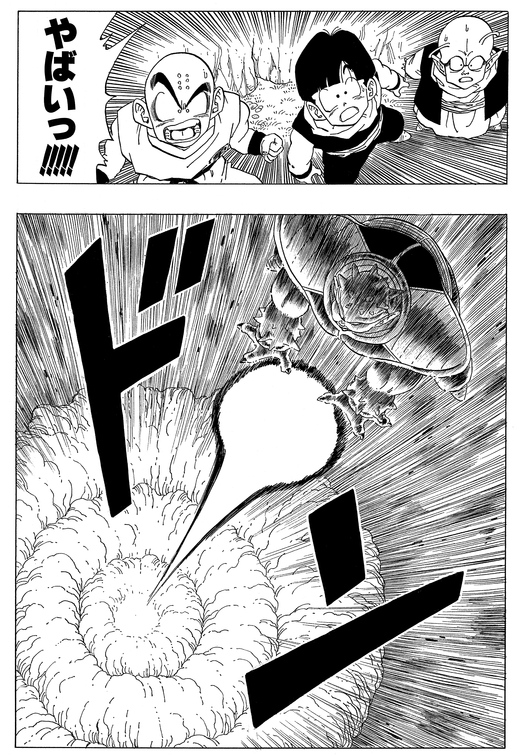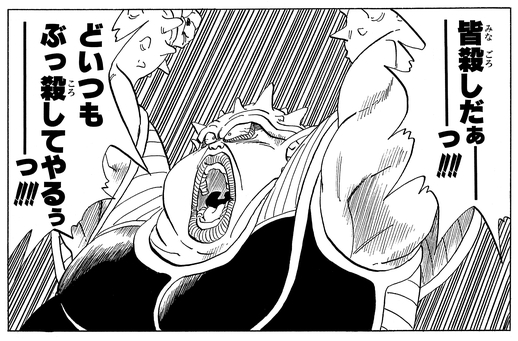 In an attempt to seize the Dragon Balls by force, Dodoria attacks a Namekian village. Then, enraged when his Scouter is destroyed by an Elder, he yells, "I'll kill them all!!!!" before attacking the Namekian youths and Elders one by one.