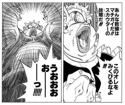 He tries to return to Frieza but is caught completely off guard by a surprise attack from Vegeta! Dodoria refuses to believe his Scouter when it shows him Vegeta's Power Level of 24,000, shouting, "That number was a mistake!! The Scouter was broken!!" In his fury, Dodoria launches a barrage of attacks, but they are all dodged easily by the Saiyan, who even sneaks behind him!
