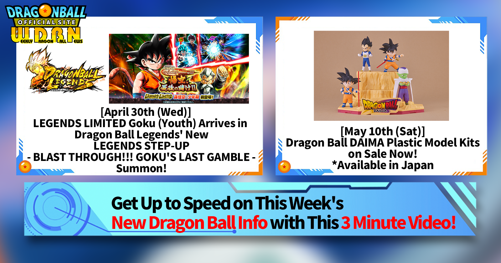 "Weekly Dragon Ball News" is a video series updated every Monday (JST) to bring you the latest news in the world of Dragon Ball! Join V Jump editor Victory Uchida as he covers all the hottest info released in the previous week as well as fresh updates like new product info and site news for the week to come!