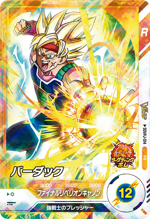 This issue comes with a bonus "SDVPJ-014 Bardock" card! When winning an attacking strike battle, all enemies in the area attacked will have their power level reduced by 1000! Plus, this card features the new action skill "Targeting Bomb", introduced in this fourth set!