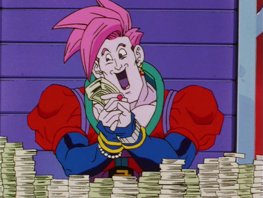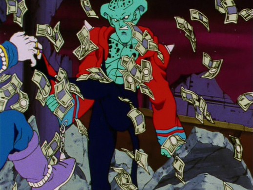 Although Goku and Redgic finish their fight amicably, Don Kia desperately scrounges up the money scattered around his office and offers it to Redgic, pleading, "I've been saving this for you...finish them and it will be all yours!" to which Redgic responds, "Didn’t your mother tell you? Money isn't everything!"