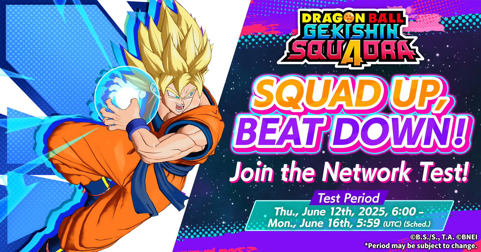 A trailer announcing the newly decided title, DRAGON BALL GEKISHIN SQUADRA, as well as the Network Test scheduled to begin on June 12th (JST), is now live! This video also reveals new characters added since the open beta test last August! Keep an eye on the official X account to see even more new characters!
