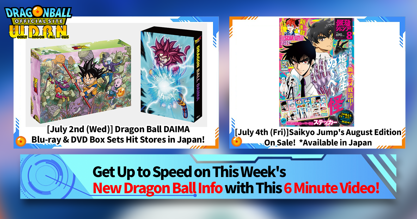 "Weekly Dragon Ball News" is a video series updated every Monday (JST) to bring you the latest news in the world of Dragon Ball! Join V Jump editor Victory Uchida as he covers all the hottest info released in the previous week as well as fresh updates like new product info and site news for the week to come!
