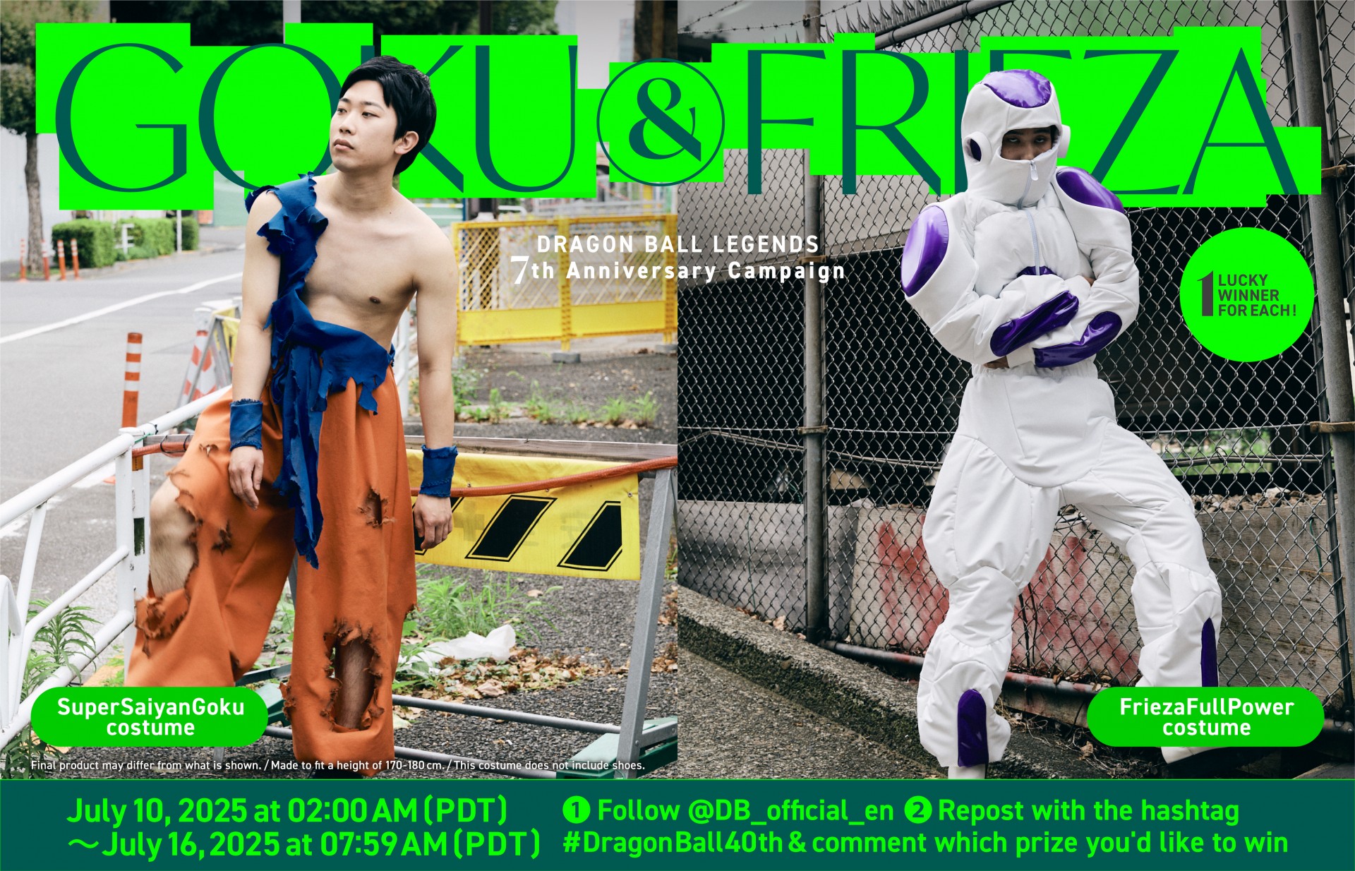 Repost the designated post with the hashtag #DragonBall40th and comment which item you would like to win (either #SuperSayanGoku Costume or #FriezaFullPower Costume