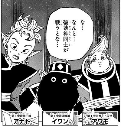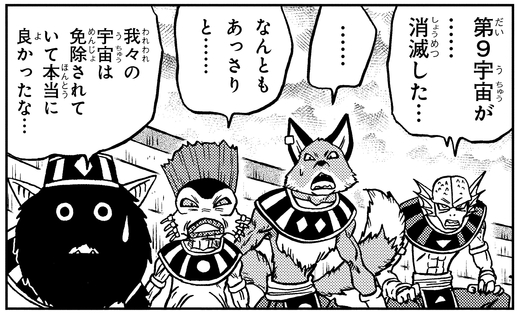 He later watches the Tournament of Power from the bleachers alongside the Gods of Destruction from Universes 12, 5, and 8, and after seeing other universes be erased upon defeat, remarks in relief, "Good thing our universes are exempt from this..."