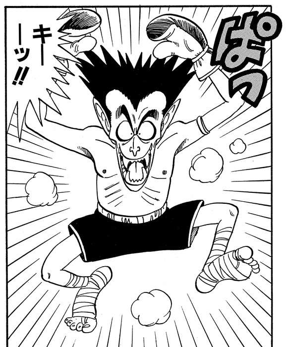 After dodging Krillin's attacks, he transforms into a bat and confuses Krillin with his quick movements, then latches onto his head and begins sucking his blood.