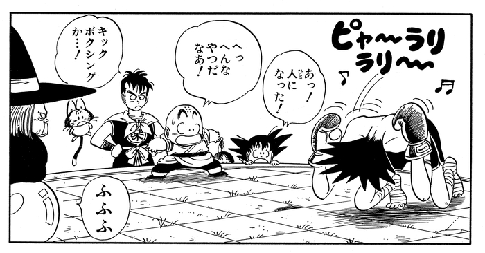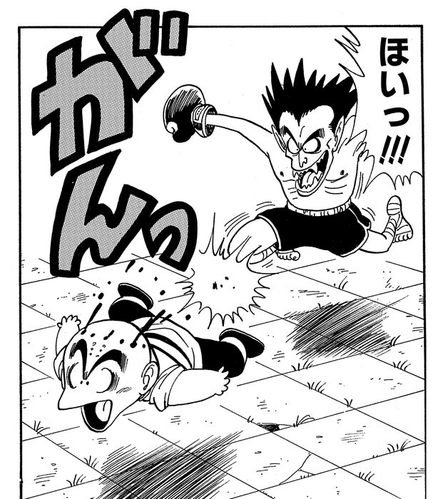 He then claims victory by kicking the dazed, bleeding Krillin out of the ring.