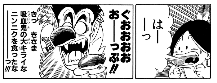 Upa, having eaten garlic beforehand in preparation for this battle, uses his breath on Draculaman, who then turns into a bat to escape.