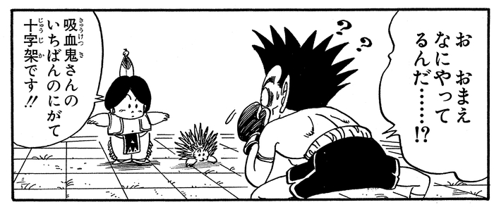 What's more, when Upa stands straight and spreads his arms to mimic a cross, Draculaman once again takes his bat form and flees.