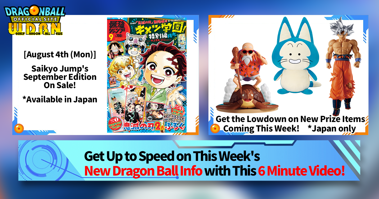 "Weekly Dragon Ball News" is a video series updated every Monday (JST) to bring you the latest news in the world of Dragon Ball! Join V Jump editor Victory Uchida as he covers all the hottest info released in the previous week as well as fresh updates like new product info and site news for the week to come!