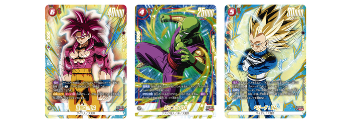 The "Red" SR Alt-Art cards are three characters who played a major role in Dragon Ball DAIMA: "Son Goku: DA", "Piccolo: DA", and "Vegeta: DA"! Both "Son Goku: DA" and "Vegeta: DA" have the new skill "Evolve", which allows you to play on top of specific cards for a low skill cost!