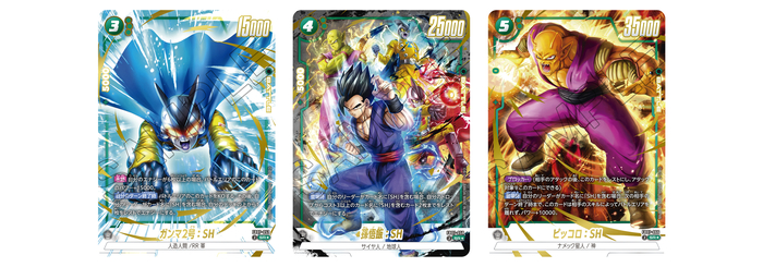 The "Green" SR Alt-Art cards are "Gamma 2: SH", "Son Gohan: SH", and "Piccolo: SH", all key fighters in the Dragon Ball Super: SUPER HERO movie! The illustration for "Son Gohan: SH" features Piccolo after his potential has been unlocked by Shenron, plus the daring android duo themselves, making it a must-see for any fan of the film! That's not all! This card also has a powerful skill that will allow you to choose up to 2 specified cards from your Drop and add them to your energy!