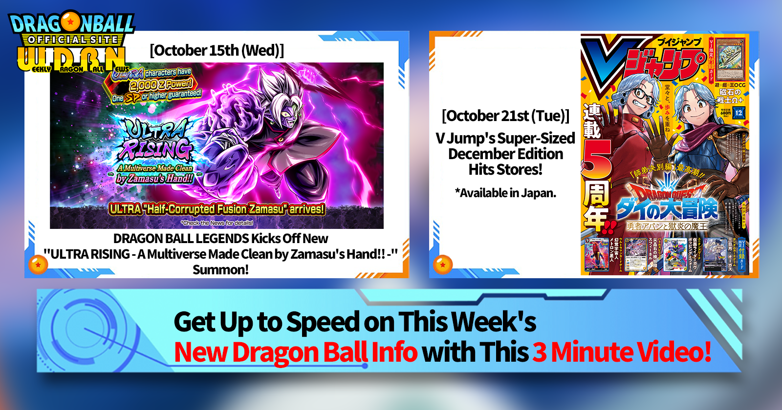 "Weekly Dragon Ball News" is a video series updated every Monday (JST) to bring you the latest news in the world of Dragon Ball! Join V Jump editor Victory Uchida as he covers all the hottest info released in the previous week as well as fresh updates like new product info and site news for the week to come!