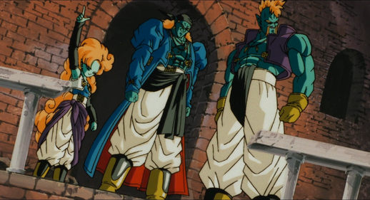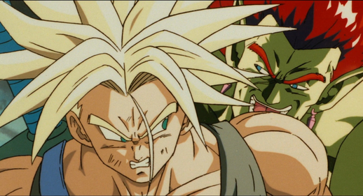 Taking advantage of his henchmen's special abilities to immobilize Trunks, Bojack cowardly fires an Energy Wave point-blank into his back. Now also rendered immobile, Gohan is subjected to a one-sided beatdown.