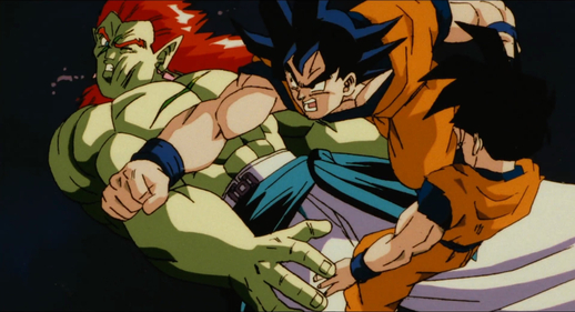 Goku, who had been following the battle from Another World and unable to bear it any longer, uses teleportation to reach the battlefield and intervene, landing a blow on Bojack and rescuing Gohan in the process.