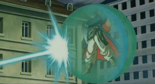 Piccolo attacks, but Bojack counters with an energy blast. He attempts to land the coup de grâce on a fallen Piccolo, only to be saved at the last second by Trunks, who unleashes a flurry of Energy Wave attacks at Bojack. But sadly for our hero, Bojack deflects these by creating a barrier around himself.