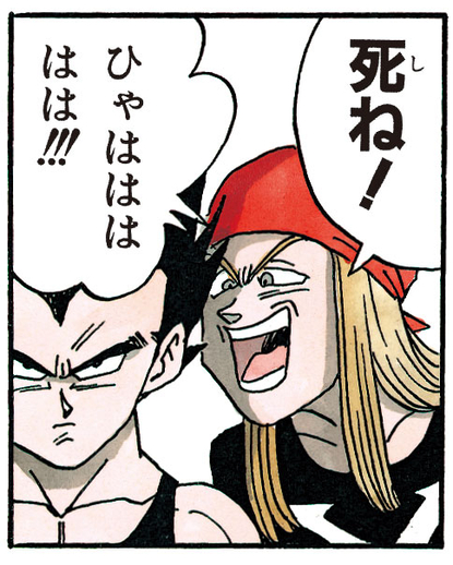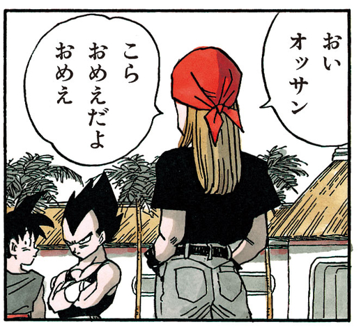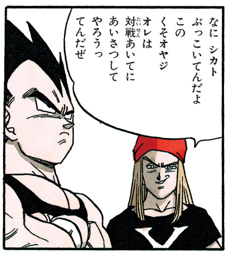 The young fighter greets Vegeta with a flippant "Hey, dude", but the Saiyan doesn't so much as glance his way. At this he bristles, "You think you're too good? I'm talkin' to you" and in an attempt to provoke his opponent, he gets in Vegeta's face, taunting him with "Ha! You goin' down, dude!!!"