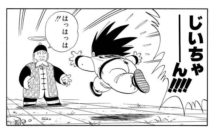 Having granted a wish, the Dragon Balls turn to stone for a one-year period. Goku parts ways with Bulma and the others to further his training and eventually visits Kamesennin to ask to be taken on as a disciple. Alongside fellow disciple Krillin, Goku spends his days training in preparation to enter the Tenkaichi Budokai, a gathering where martial arts experts put their strength to the test. The panel below provides a snapshot of their daily routine.