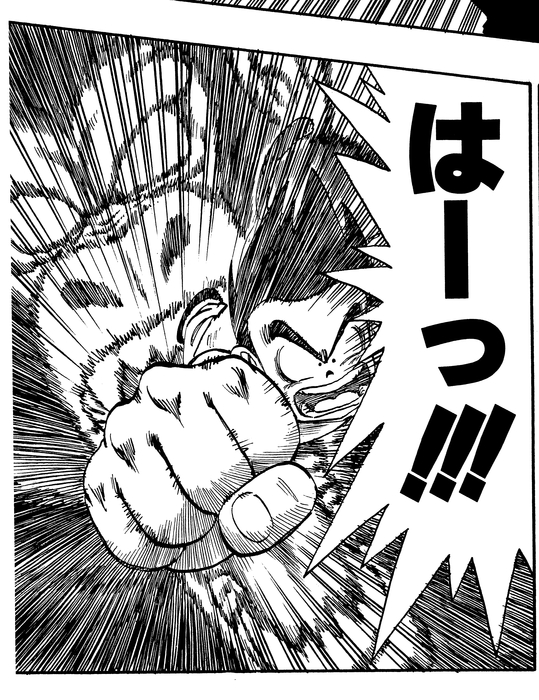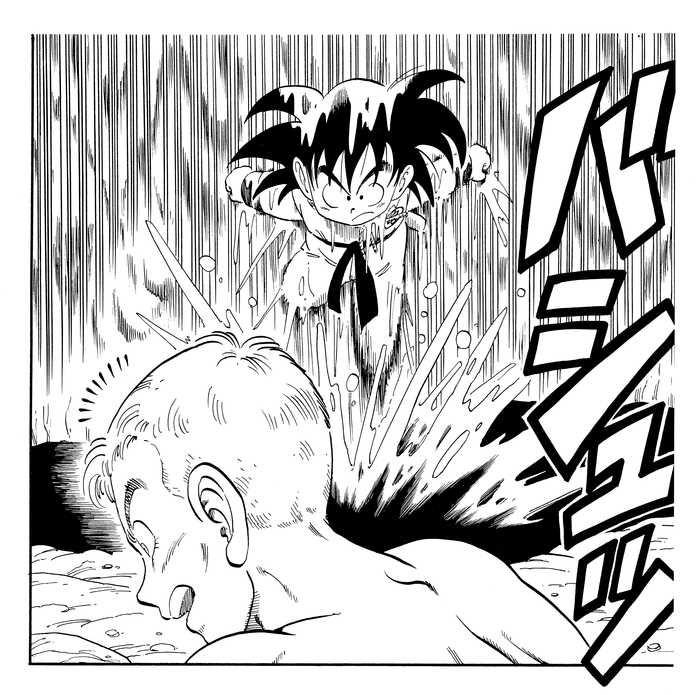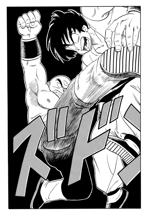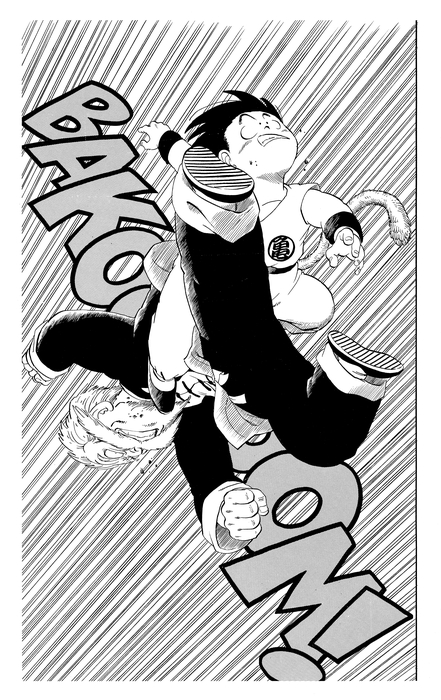 The final match of the 22nd Tenkaichi Budokai is a showdown between Goku and Tenshinhan. With speeds so fast that even the announcer can't keep up, a thrilling non-stop exchange of blows unfolds. And this is the exact panel Goku lands a skillful strike!