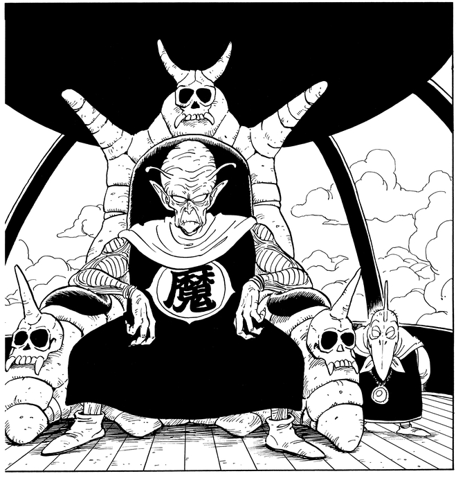 With an appearance considerably different from any other character that had appeared before, plus his seat upon a throne decorated with skulls, this scene truly conveys to readers the fearsome, imposing aura befitting a great demon king. Eventually, he succeeds in wresting the Dragon Balls from Goku and regaining his youth, after which he sets his sights on world domination.