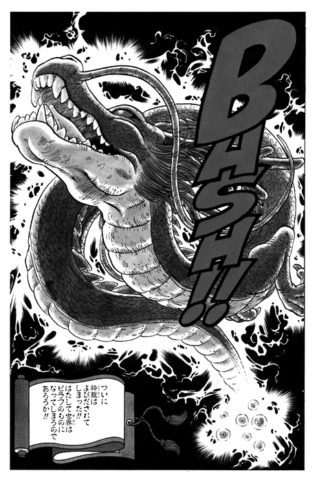 Shenron's first appearance took up an entire page in all of its stunning glory, conveying the awesome power of this impressive being! Immediately after, Oolong rushes out of the castle and manages to sneak in a wish before Pilaf can make his request to Shenron. Meanwhile, Goku transforms into a Great Ape under the full moon and crushes Pilaf's Castle, along with Pilaf's lofty aspirations.