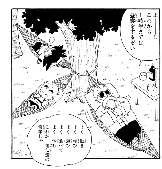 As you can see, the Kame School's training focuses not only on building physical strength, but also emphasizes eating, resting, and studying properly. Much later, just before the beginning of the Cell Games, we see Goku cut his training short in the Room of Spirit and Time to spend a moment with Chichi and Gohan; perhaps indicating that Goku took Kamesennin's teachings to heart.