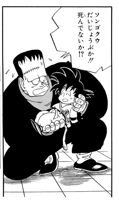 Here, Goku has been shot with a powerful gun by General White and is being gently held by the new friend he made in Muscle Tower, Android 8, also known as Hatchan. In this panel we can get a glimpse of the budding relationship of trust and friendship between the two. After this, Muscle Tower is successfully toppled and Hatchan is taken in by the residents of Jingle Village as one of their own.