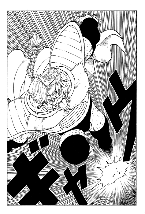 This panel, which covered an entire page, not only conveys Zarbon's post-transformation appearance, but also the heightened speed and intensity afforded to him by this increase in power. The wounds Vegeta suffers in his fight against Zarbon are near fatal, but on Frieza's insistence, he is given treatment so that he may later be interrogated as to the location of the Dragon Balls.