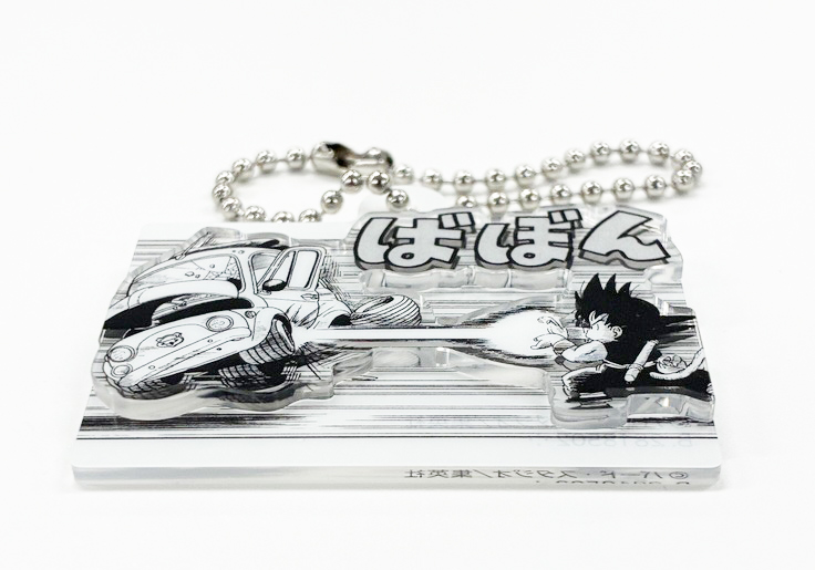 Die-cutting techniques were utilized on each of these two-layer acrylic charms to make Goku and the sound effects really pop!