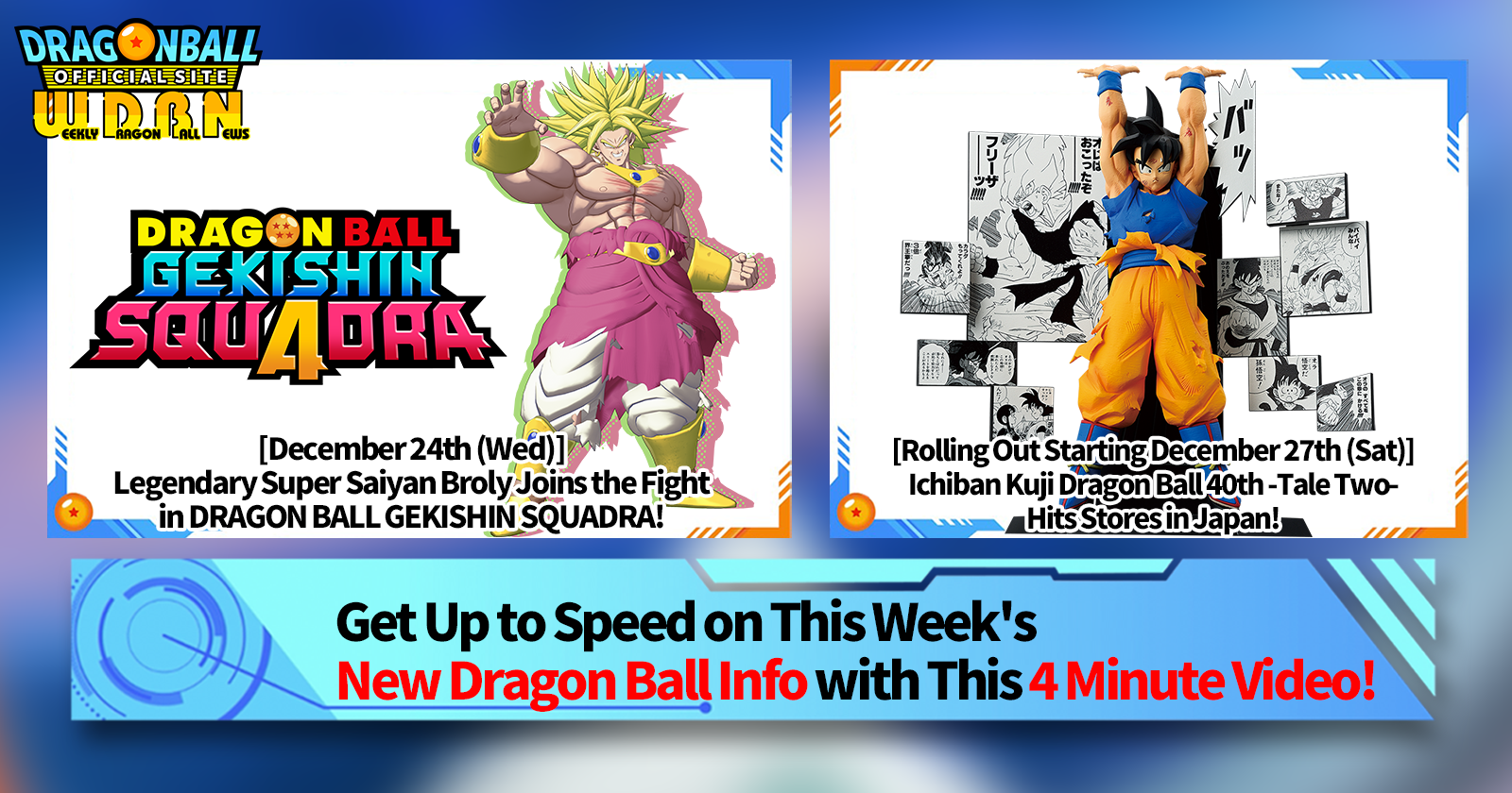 "Weekly Dragon Ball News" is a video series updated every Monday (JST) to bring you the latest news in the world of Dragon Ball! Join V Jump editor Victory Uchida as he covers all the hottest info released in the previous week as well as fresh updates like new product info and site news for the week to come!