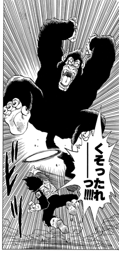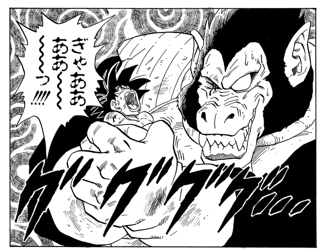 Although he prevents Goku from using the Genki-Dama and then attempts to crush him in his fists, a surprise attack by Yajirobe severs his tail, returning him to his normal form.