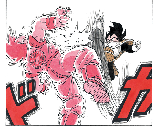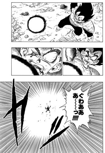 Vegeta manages to cut off Gohan's tail and appears to be in the clear, but as Gohan falls to the ground, Vegeta finds himself flattened under the Great Ape's ponderous weight.