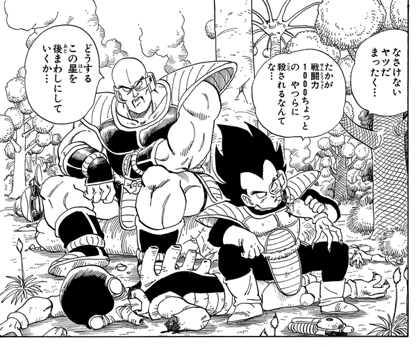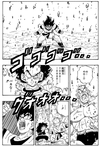 Three hours pass with no sign of Goku, and Nappa resumes his assault. Soon after Piccolo's defeat, Goku arrives, stunning Nappa and Vegeta with his Power Level reading.