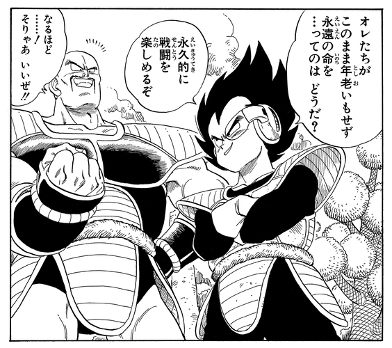 The two learn of the Dragon Balls from Raditz, who was defeated by Goku and Piccolo, and have now come to invade Earth and obtain eternal life.