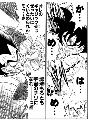 His pride injured by Goku's counterattack using Kaio-Ken: Kaio-Ken Times Three, the enraged Vegeta snarls, "Prepare to die with this world you love!!!!!" as he fires off his signature move, the Galick Gun. However, Goku is able to deflect this attack with Kaio-Ken: Kaio-Ken Times Four and a Kamehameha of his own.
