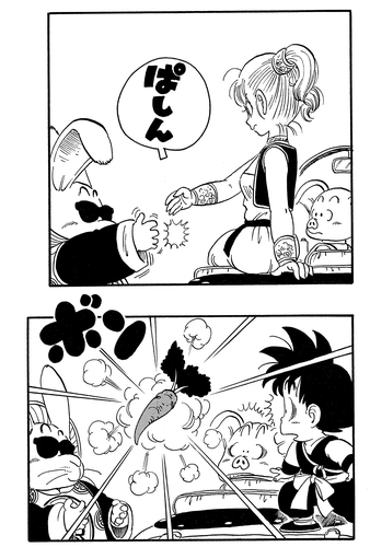 After obtaining the Seven-Star Ball on Fry-Pan Mountain, the party stops by a town where they end up crossing paths with the villainous Rabbit Gang. Their leader, Toninjinka, turns Bulma into a carrot with his Carrotification technique, but she is able to return to her normal form with the help of Yamcha, who had secretly been following them.
