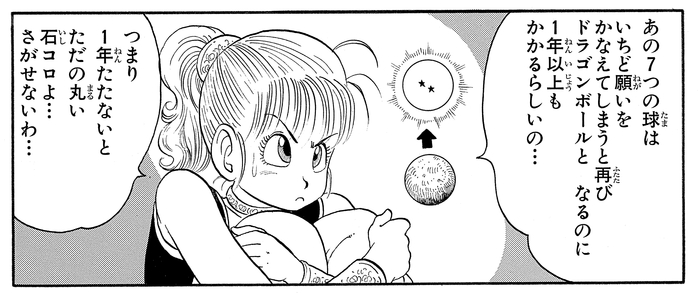 Pilaf summons Shenron to make his wish but is intercepted by Oolong. Having granted a wish, the Dragon Balls turn to stone and cannot be used again for a full year, leaving Bulma crestfallen.