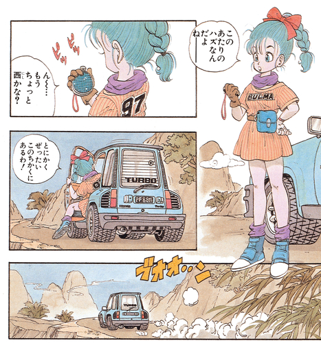 She brushes Goku off after seeing him attempt to return a sea turtle to its home in the ocean, saying, "We can't be wasting time on turtles!!" But upon seeing that Goku is carrying the Four-Star Ball with him, she changes course and follows after him. When they reach the ocean, the sea turtle's friend, Kamesennin appears. As a thank-you gift, he hands over the Three-Star Ball, which he had been wearing around his neck.