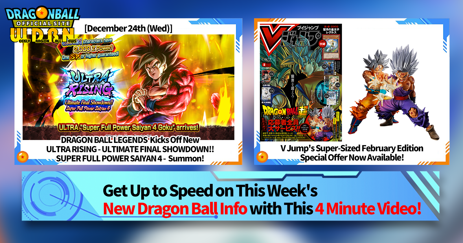 "Weekly Dragon Ball News" is a video series updated every Monday (JST) to bring you the latest news in the world of Dragon Ball! Join V Jump editor Victory Uchida as he covers all the hottest info released in the previous week as well as fresh updates like new product info and site news for the week to come!