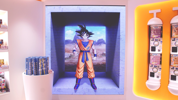 Our first highlight to watch out for is this screen, located at the back of the store. Here, you can enjoy DRAGON BALL STORE TOKYO-original content, plus famous opening and ending scenes from over the years! It's like Goku is appearing right before your very eyes!