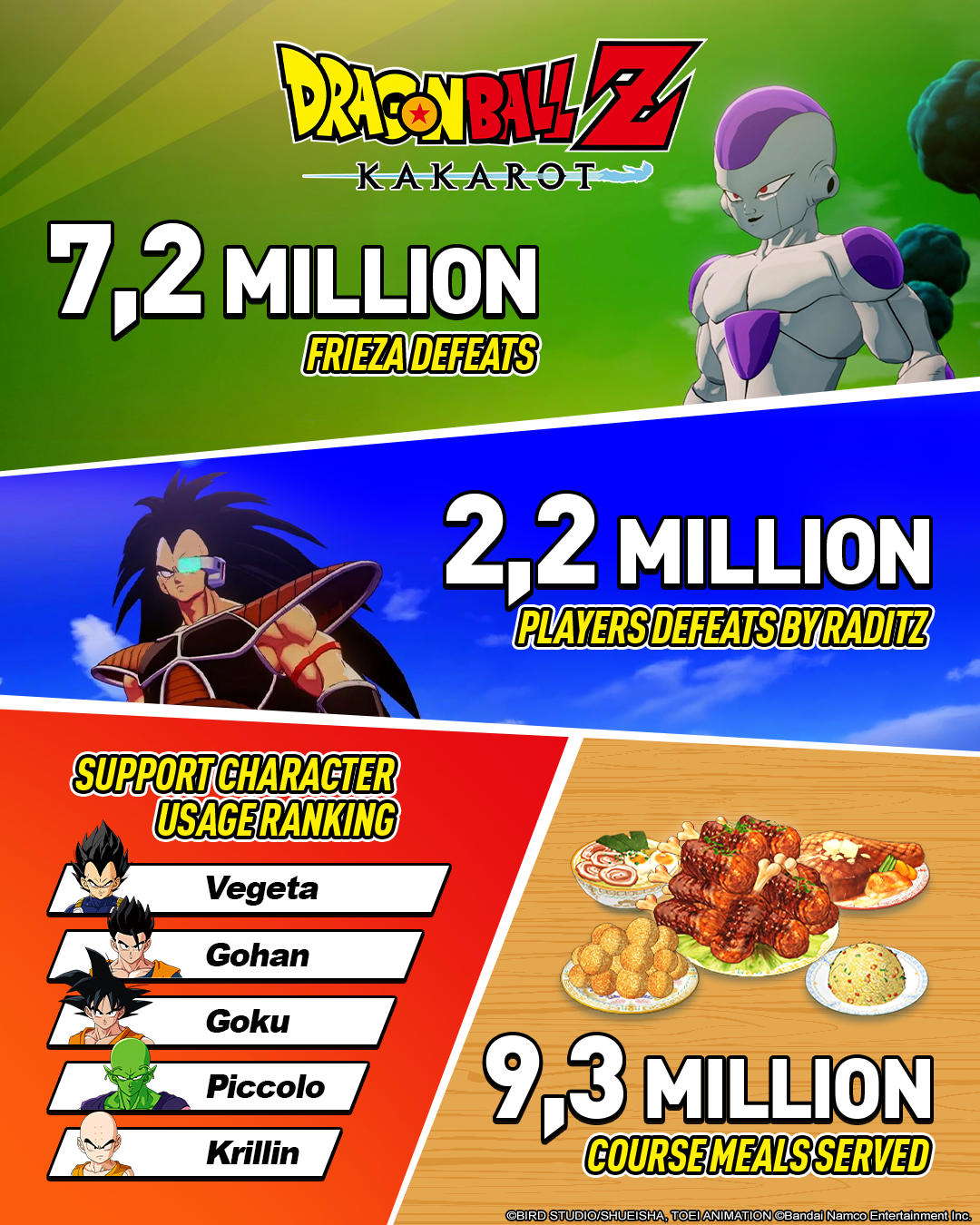 To celebrate this amazing milestone, we're releasing DRAGON BALL Z: KAKAROT's Latest Player Stats! This will allow players to see intriguing gameplay data from around the world, including the total number of Kamehamehas fired, the total number of times Goku has been defeated by his first formidable foe, Raditz, and more!