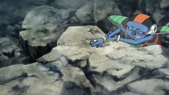 Sorbet watches Frieza and Goku's one-on-one battle from behind a rock, but when Frieza is cornered, he jumps in to fire a beam from the ring on his finger, striking the Saiyan on the left side of his chest. This was the contingency plan that Frieza had instructed him to follow beforehand.