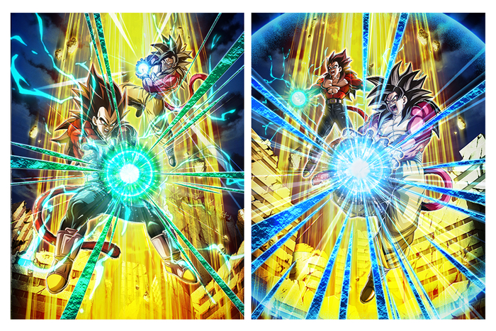 Right: "[Final Showdown Against the Shadow Dragons] Super Saiyan 4 Goku + Super Saiyan 4 Vegeta"