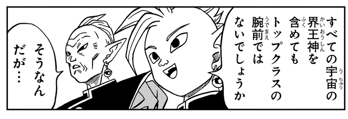 In the Supreme Kai's Realm of Universe 10, the East Supreme Kai watches over Kibito and Zamasu locked in a test of strength. Upon witnessing Zamasu's strength, he marvels, "He must be one of the most skilled fighters, even including all the Supreme Kais across the universes."