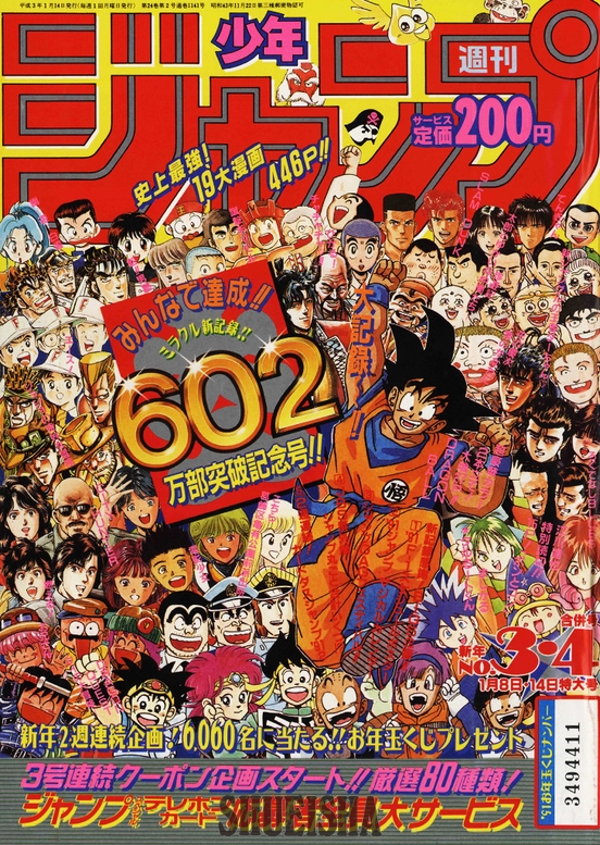 The front cover of the issue commemorating over 6.02 million issues of Weekly Shonen Jump featured a star-studded lineup of characters from 19 hit manga. Goku takes center stage, energetically throwing his arm high into the air. Upon closer inspection, Gohan, Krillin, and Bulma can also be seen rushing to join the celebrations in the outfits they wore on Planet Namek. This issue also marked Dragon Ball's sixth anniversary and featured a jaw-dropping double feature of the fight with Frieza.