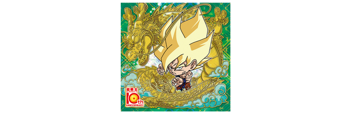 The brand-new rarity "10th Rare" has arrived! This awe-inspiring sticker features extravagant gold foil stamping embossed on a holographic background, making the illustration really pop! The sumptuous shimmer of Shenron in the background behind Super Saiyan Goku has to be seen to be believed!