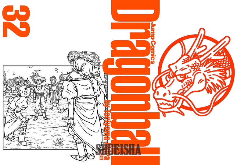 The cover of volume 32 depicts the scene in which the Elder Supreme Kai appears in the Supreme Kai's Realm. In this line art, one can discern that the lines for the Elder Supreme Kai and others in the foreground are drawn thicker to make them stand out.