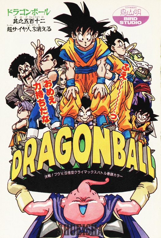 Here's a hilarious title page featuring the portly Majin Buu hoisting Goku and his friends and family up. It's brilliantly designed with its pop-art flair and incorporation of the Dragon Ball title as a platform.