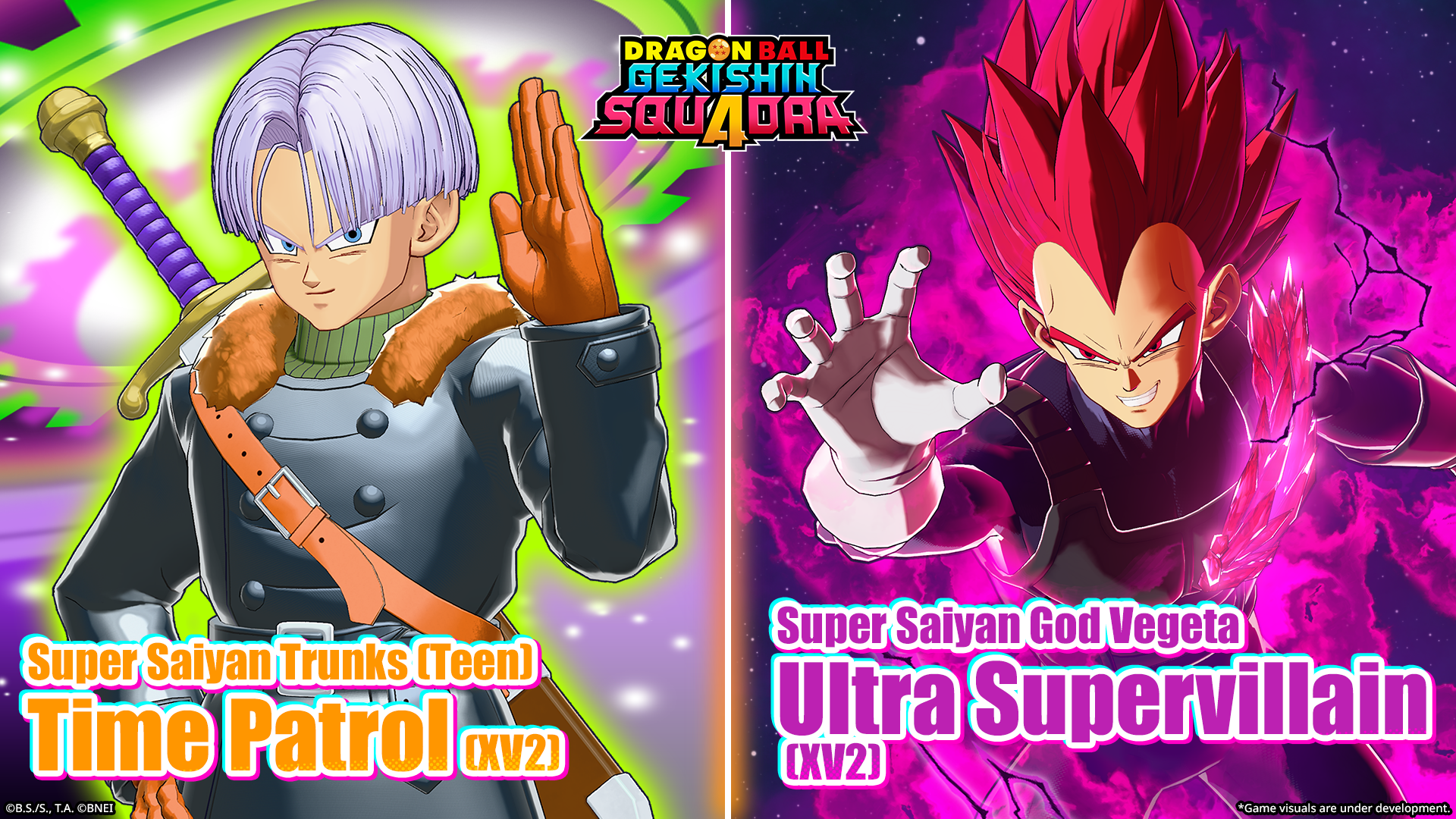 Super Saiyan Trunks (Teen) and Super Saiyan God Vegeta who also play active roles in DRAGON BALL XENOVERSE 2 are getting the Time Patrol and Ultra Supervillain skins respectively in DRAGON BALL GEKISHIN SQUADRA! There are also emotes and customization items planned, so stay tuned!