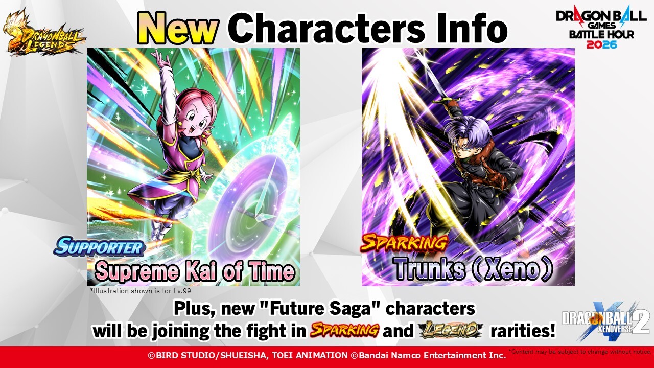 A collab campaign between DRAGON BALL LEGENDS and DRAGON BALL Z XENOVERSE 2 will begin on April 28th! A new supporter Supreme Kai of Time and SPARKING Trunks (Xeno) will be joining LEGENDS! That's not all! Another SPARKING character and a LEGEND character from the FUTURE SAGA series are planned to join the fray! There are other XENOVERSE-related events planned, so get hyped!